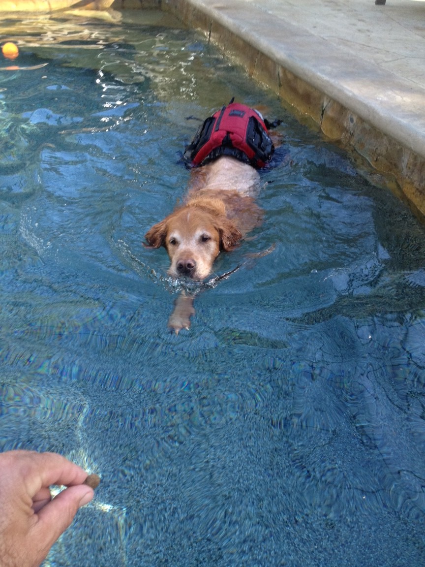 I spent yesterday hanging out in the water at the Tiki Bar, picking up all the chicks. I tell ya, playing the “I don’t walk well, but I sure get along fine in my H2O environment” card, did well for me. And today … I swam in the pool, not even wearing a life jacket (although, my Cotswold Help ’em Up harness did give me a bit of help). Did I mention, I used all four legs? Pretty cool.